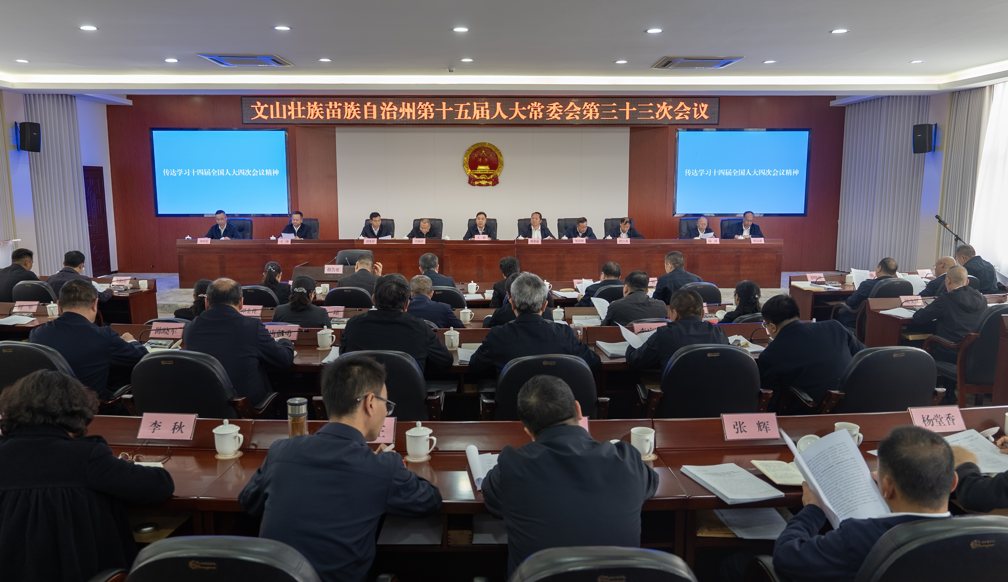 3月18日,文山州第十五届人大常委会召开第三十三次会议,传达学习十四届全国人大四次会议精神,研究部署全州人大系统贯彻落实措施,切实把思想和行动统一到大会精神上来,为全州高质量发展凝聚人大力量。