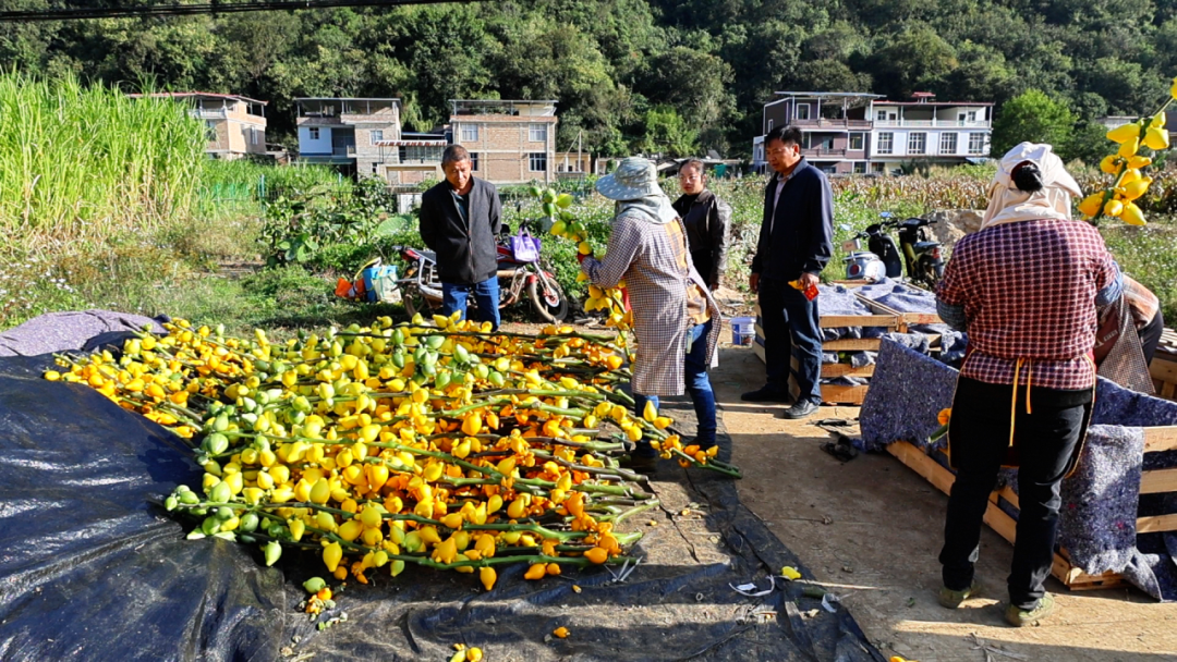 走进喜古乡花卉种植基地,眼前满是一片繁忙景象。一片碧绿中生长出一串串金黄的五代果,村民们手持剪刀,熟练地采摘、剪枝、装箱,脸上洋溢着丰收的喜悦。这片曾经的玉米地、稻谷田,如今变成了花卉的海洋。